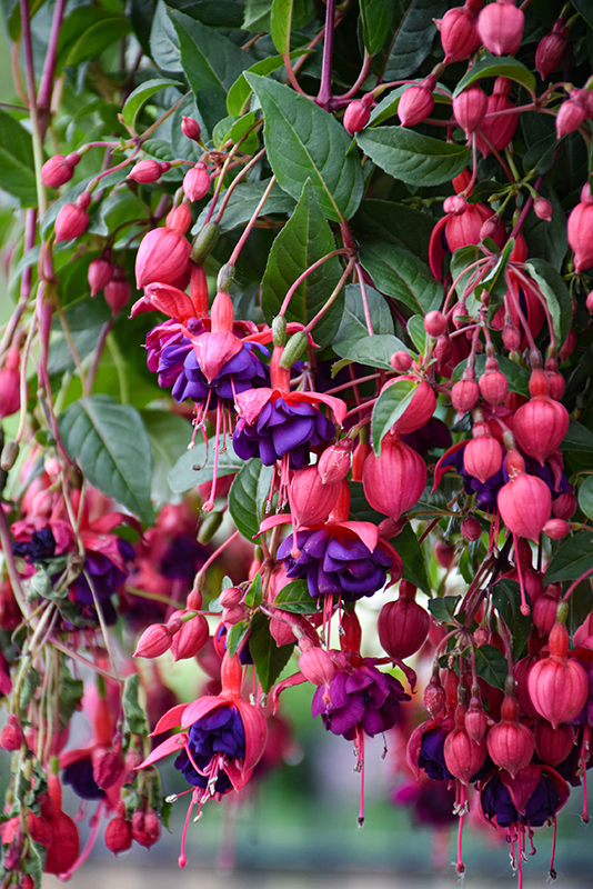 An exceptional, colorful selection, featuring huge, royal purple double blooms, with bright scarlet sepals; very attractive to hummingbirds; perfect for patio pots or hanging baskets, in sun or shade